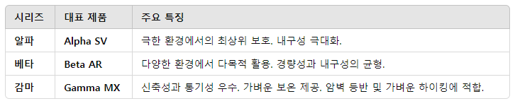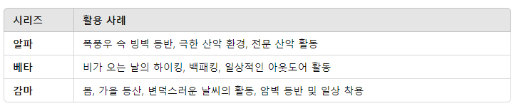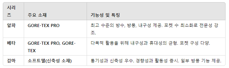 감마(Gamma): 신축성과 활동성을 중시한 소프트쉘로 가벼운 활동과 일상에 적합.