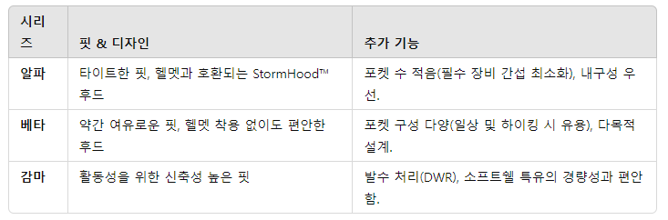 아크테릭스의 베타(Beta) 시리즈는 다양한 아웃도어 활동을 위한 다목적 하드쉘 재킷 라인으로, 방수, 방풍, 투습 기능을 갖춘 GORE-TEX 소재를 사용하여 다양한 기후 조건에서 신뢰할 수 있는 보호를 제공합니다.